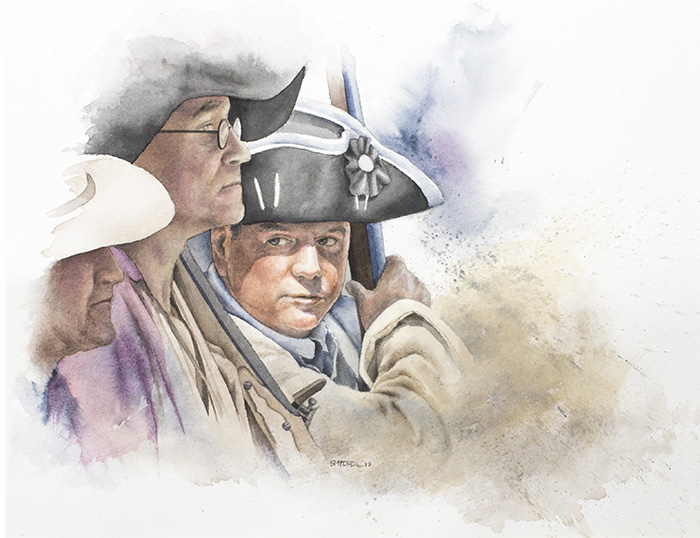 Many of the photos I take at these events eventually become reference for paintings. Here is one of my latest watercolor paintings entitled “The Muster” using reference from the Walnut Grove event. Enjoy.